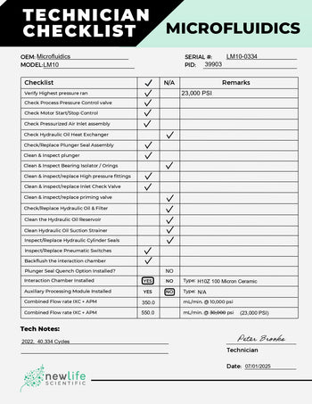 After its initial disinfection and inspection, our technicians tested the Microfluidics LM10 microfluidizer high-shear fluid processor with the following results: