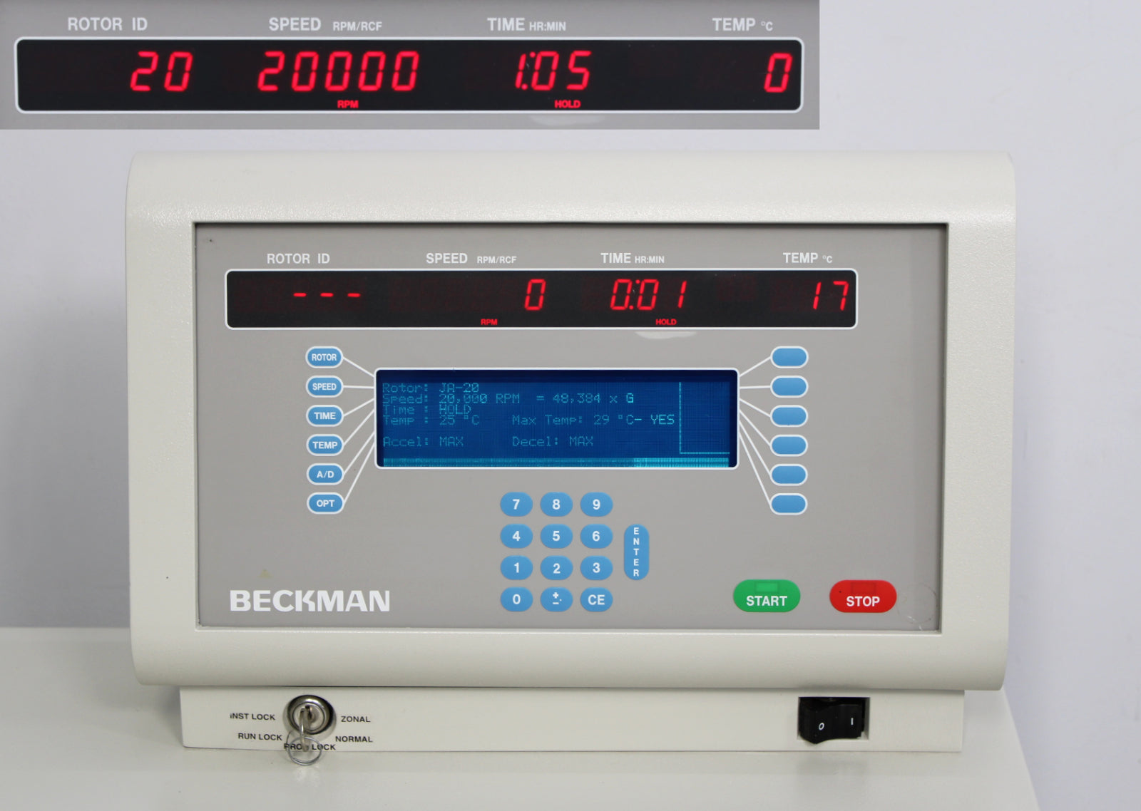 After its initial disinfection and inspection, our technicians tested the Beckman Coulter Avanti J-20 XP refrigerated floor centrifuge with the following results: