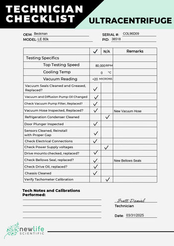 After its initial disinfection and inspection, our technicians tested the Beckman Optima LE-80K floor ultracentrifuge with the following results: