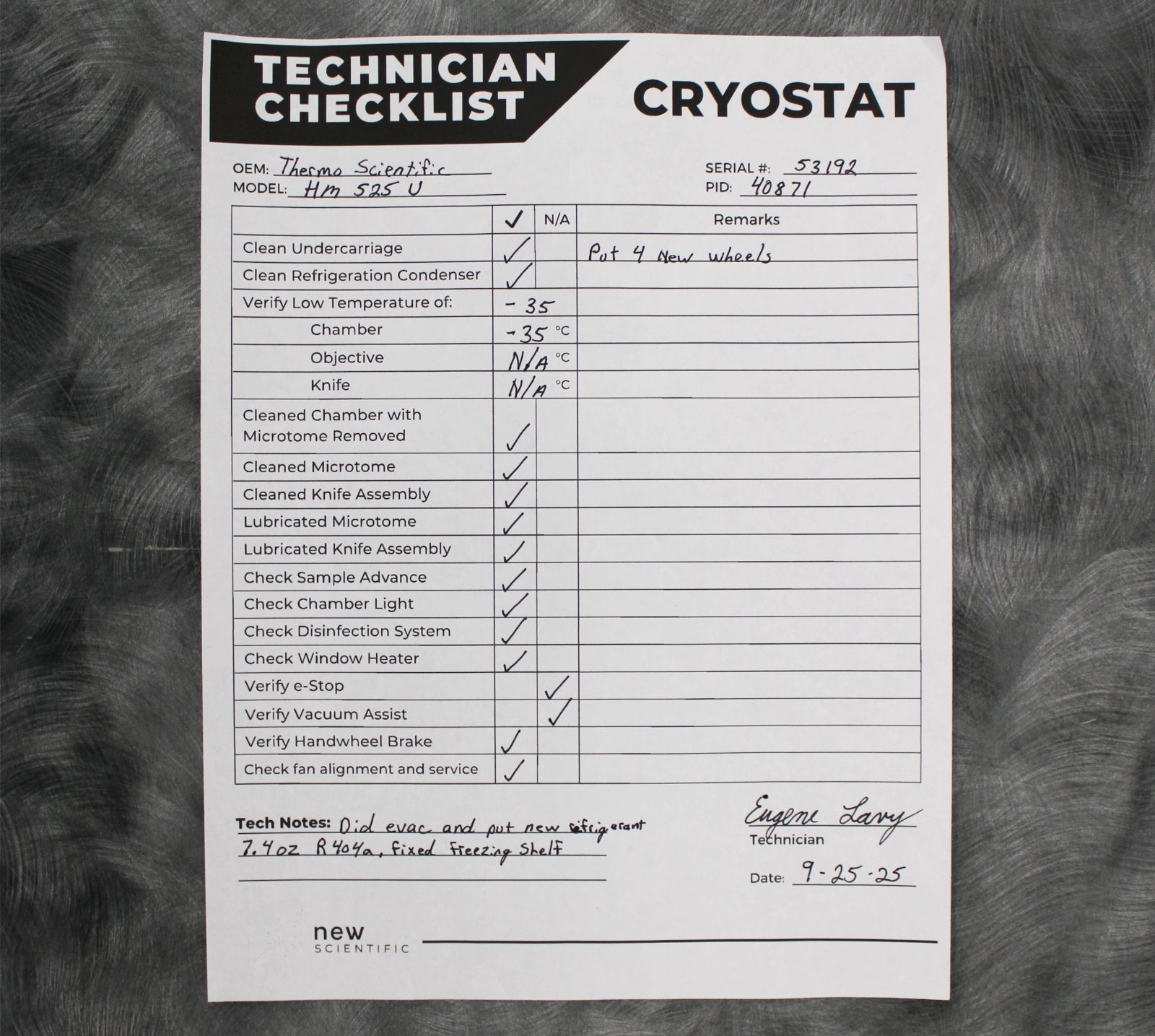 After its initial disinfection and inspection, our technicians tested the Thermo Scientific Microm HM 525 U microtome cryostat with the following results: