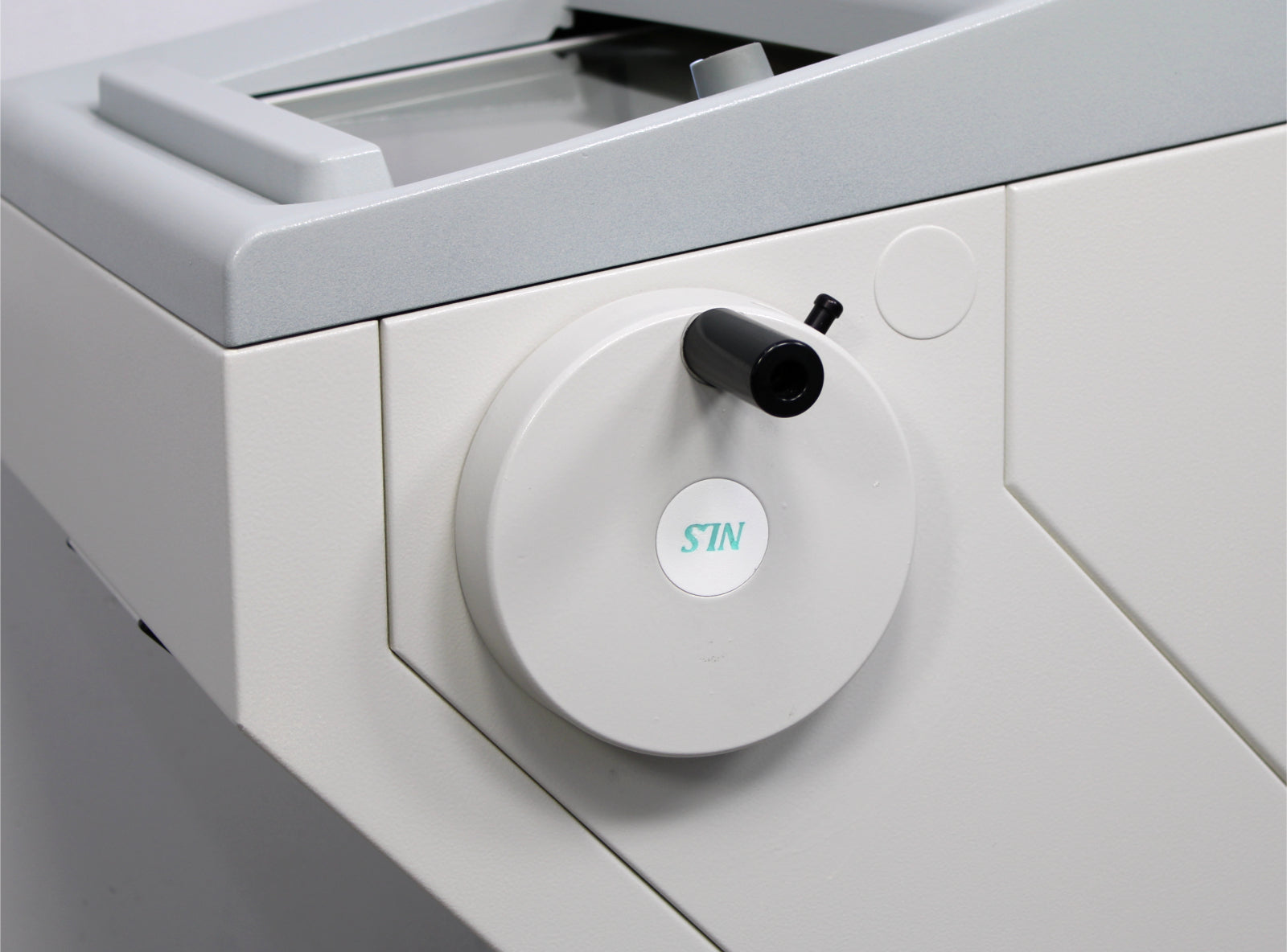 Five-digit LED-display: section thicknesses, section counter, sum of section thicknesses, remaining travel to front end position and chamber temperature