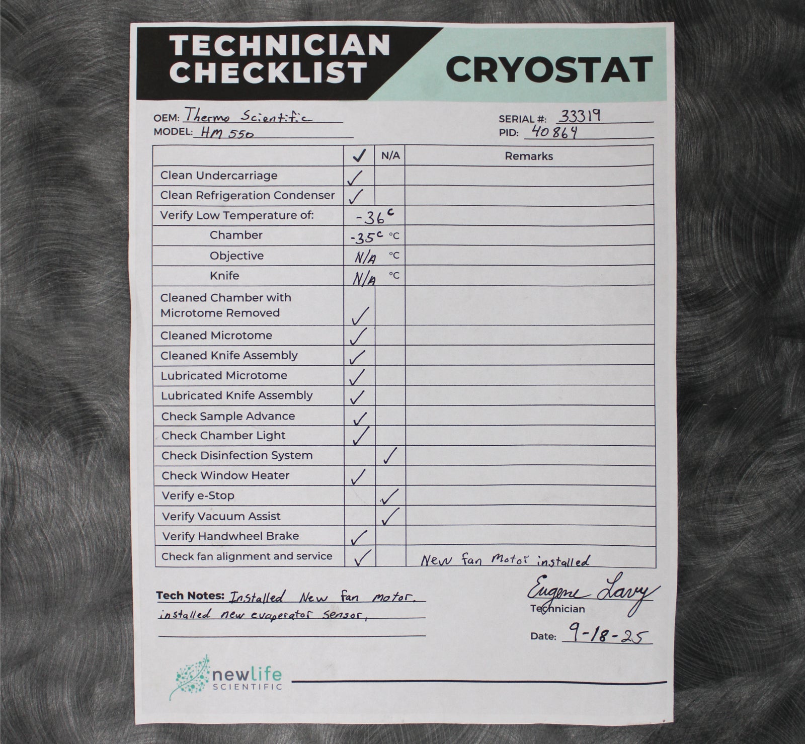 After its initial disinfection and inspection, our technicians tested the Thermo Scientific Microm HM 550 P microtome cryostat with the following results: