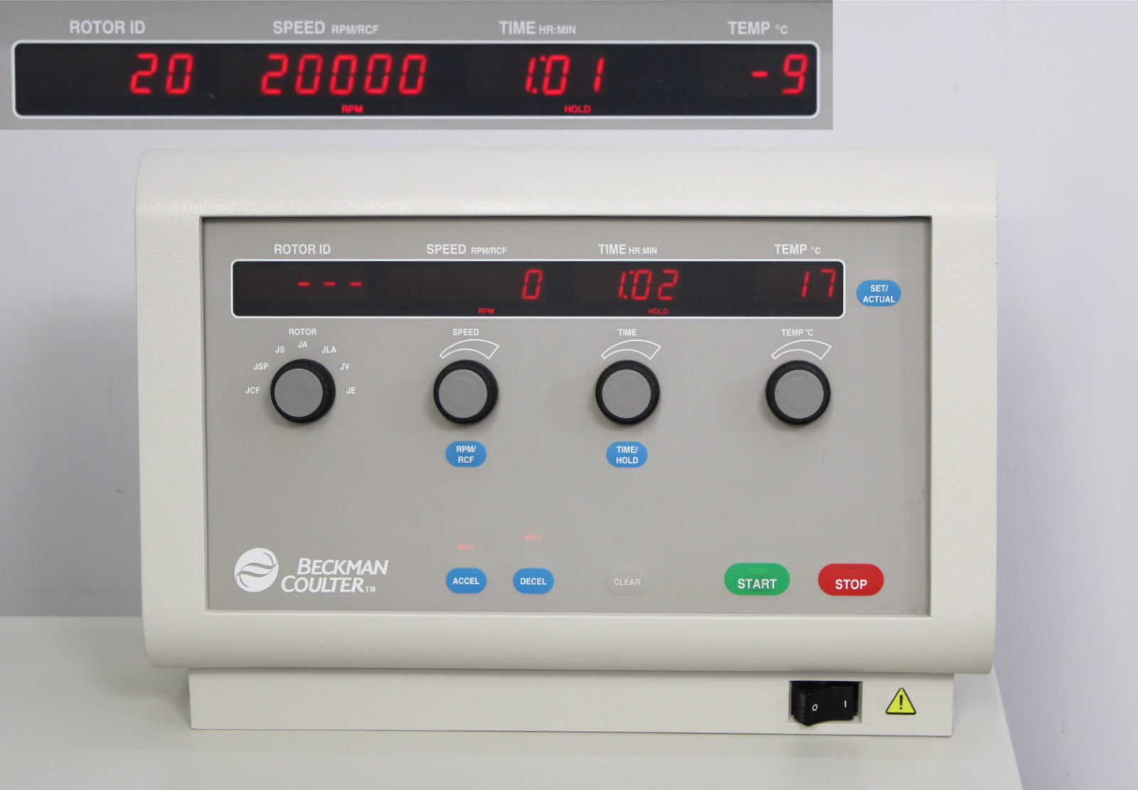 After its initial disinfection and inspection, our technicians tested the Beckman Coulter Avanti J-20 XP refrigerated floor centrifuge with the following results: