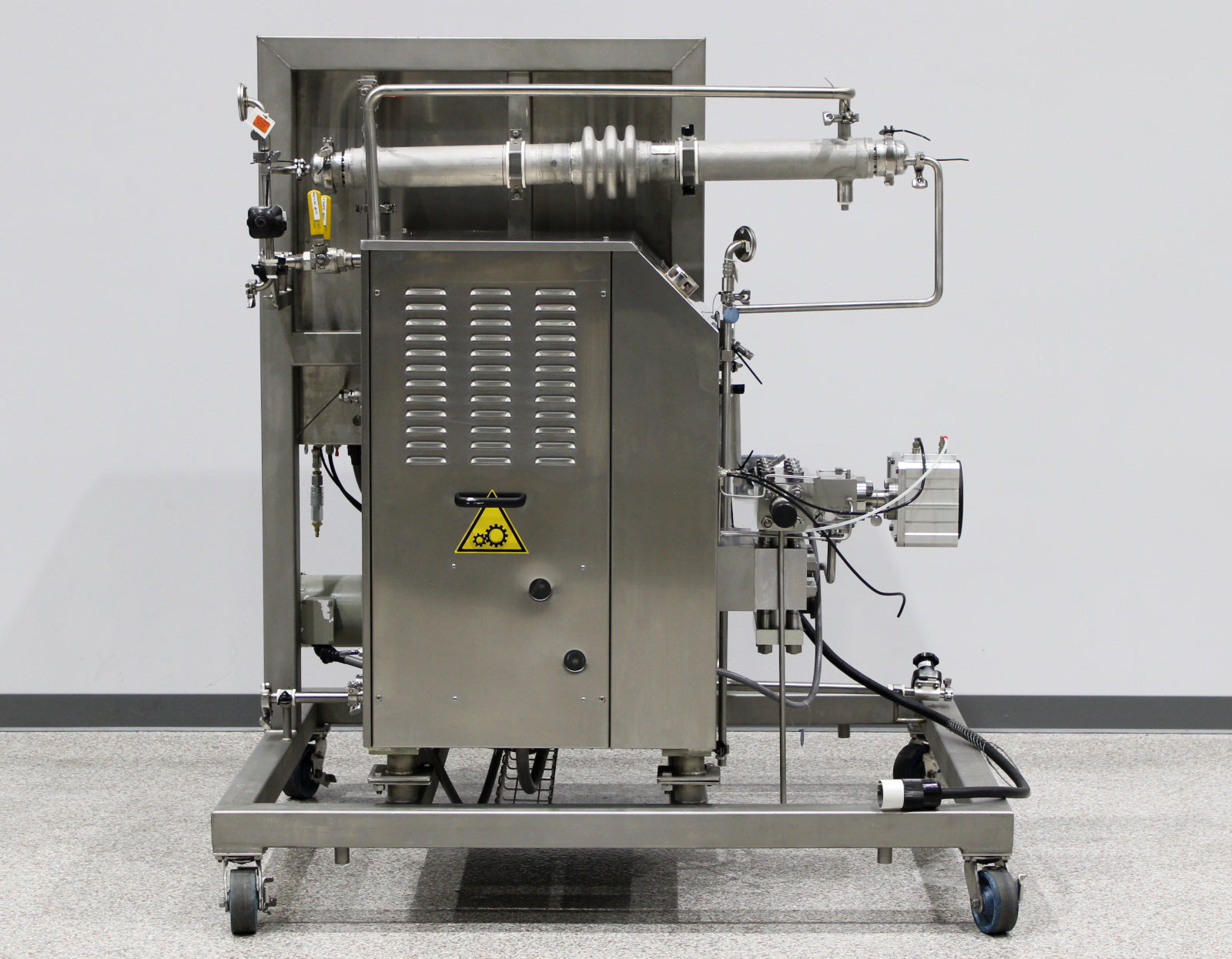 This GEA Niro Soavi NS3006H homogenizer has only 231 hours of run time and is in excellent condition. It is a 2-stage high-pressure homogenizer designed for processing fluids in the food, dairy, pharmaceutical, and chemical industries.