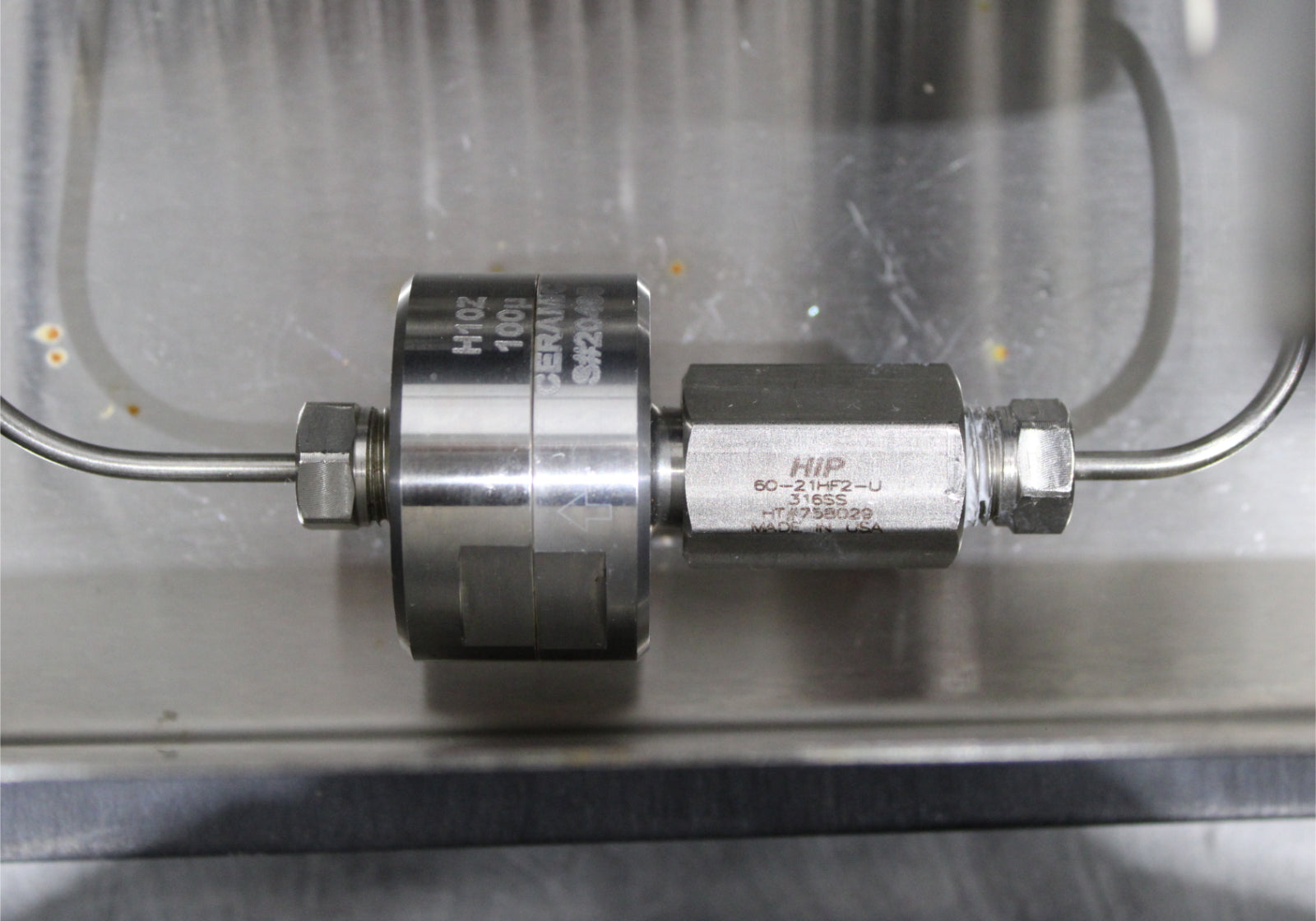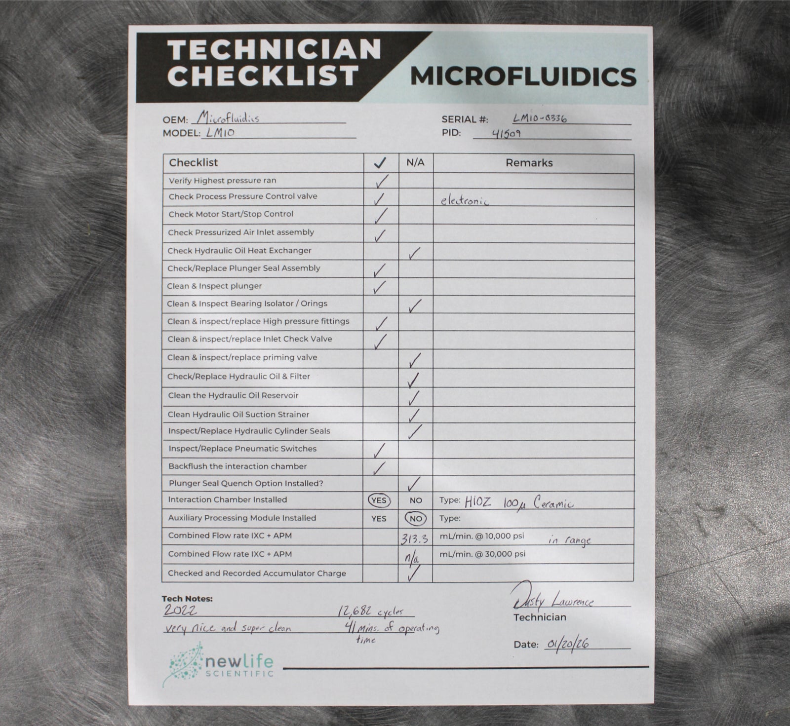 After its initial disinfection and inspection, our technicians tested the Microfluidics LM10 microfluidizer high-shear fluid processor with the following results: