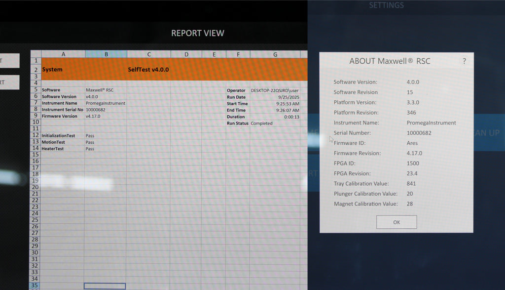 After its initial disinfection and inspection, our technicians tested the Promega Maxwell RSC instrument with the following results: