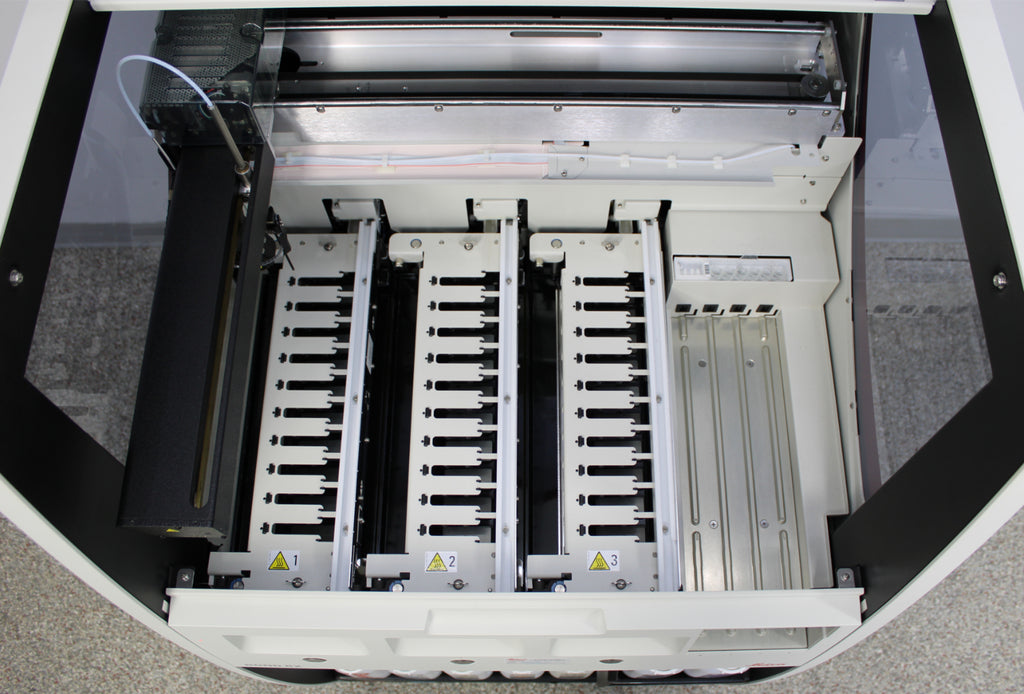 30 Finished trays (10 slides) may be replaced continuously