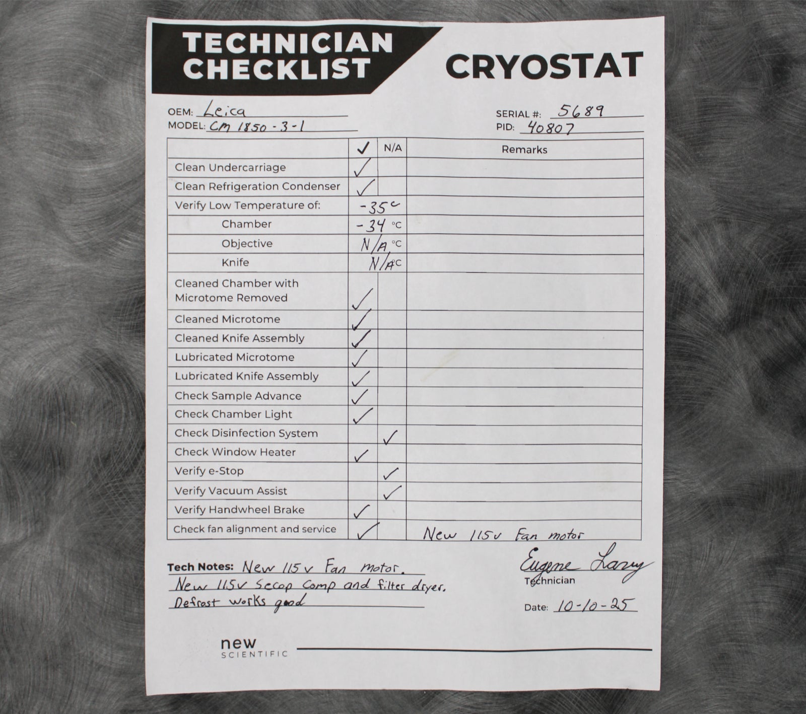 After its initial disinfection and inspection, our technicians tested the Leica CM1850-3-1 cryostat microtome with the following results: