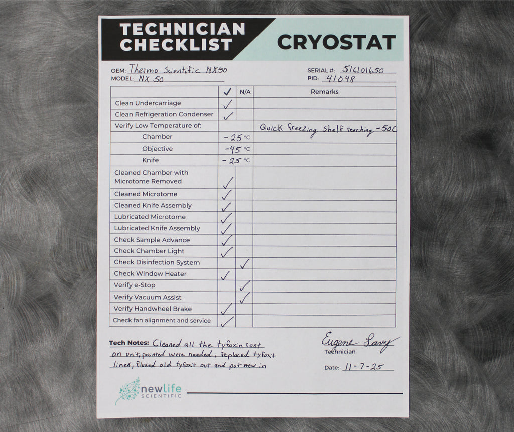 After its initial disinfection and inspection, our technicians tested the Thermo Scientific CryoStar NX50 HOP microtome cryostat with the following results: