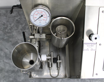 The Microfluidics M-110P microfluidizer reduces particle sizes and promotes fluid consistency and uniformity through emulsification, deagglomeration, particle size reduction, cell disruption and homogenization in laboratory settings in pharmaceutical, cosmetic, food and beverage or biotechnology applications. The product flow rate produces up to 120ml per minute, and it has a 70-degree Celsius temperature limit.