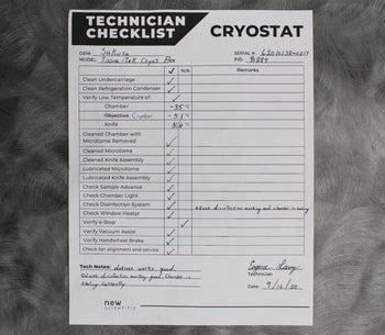 After its initial disinfection and inspection, our technicians tested the Sakura Tissue-Tek Cryo3 Flex D 6201 microtome cryostat with the following results: