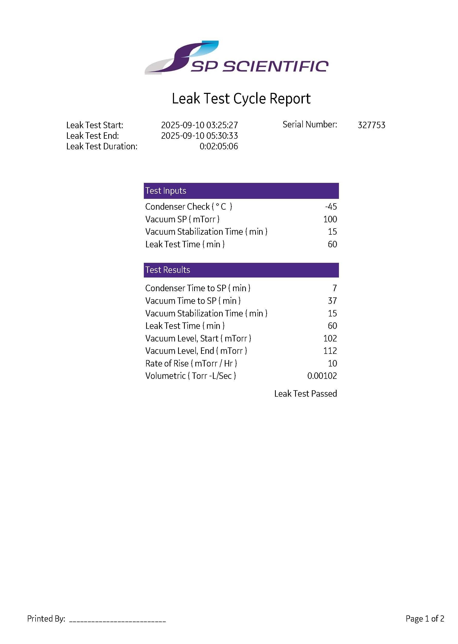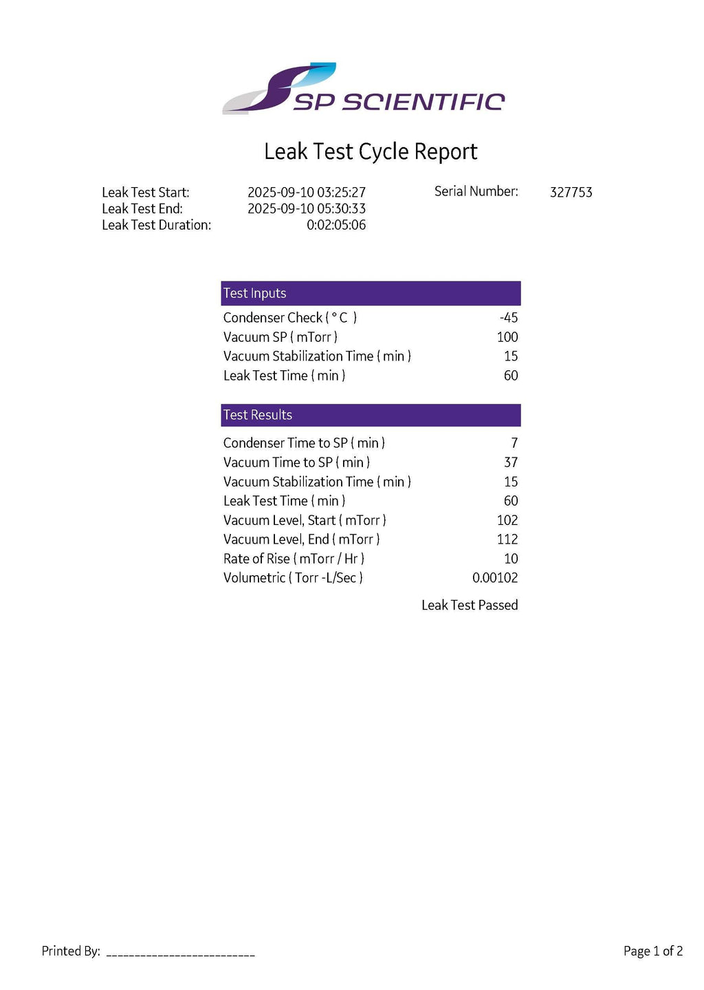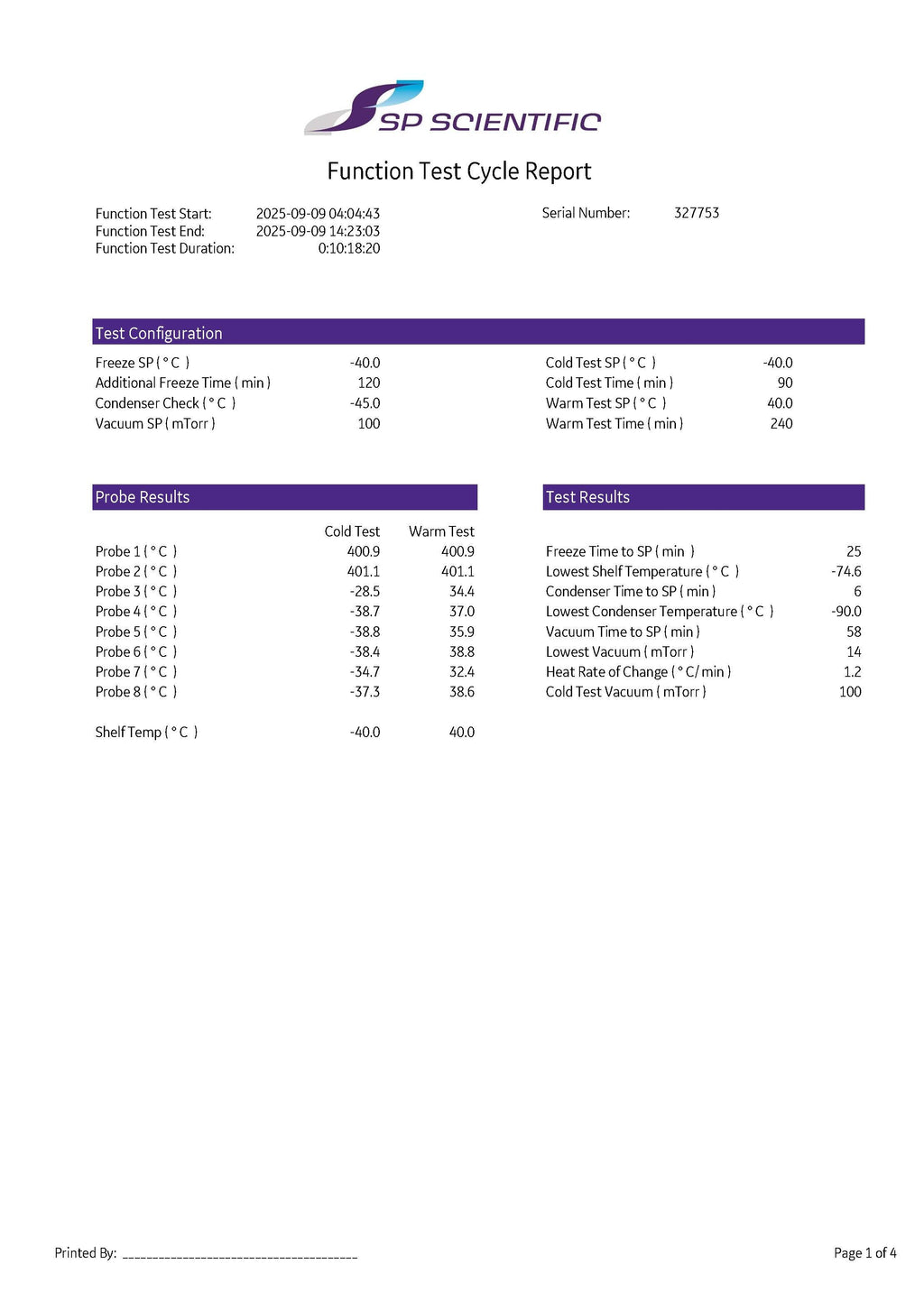 - Shelf temperature achieved -74°C (manufacturer’s spec): PASSED