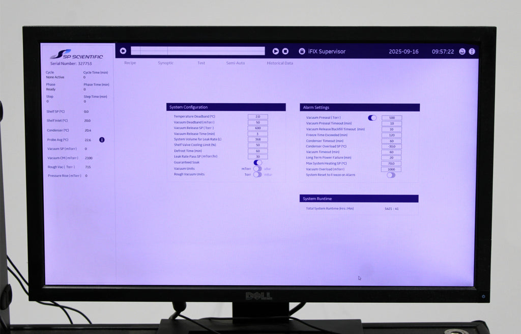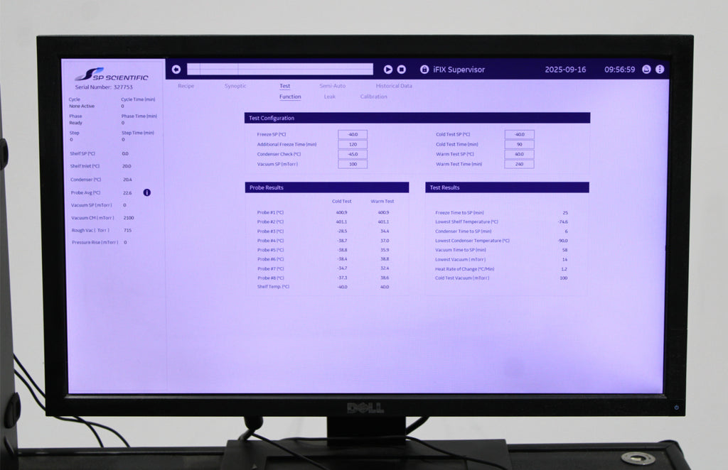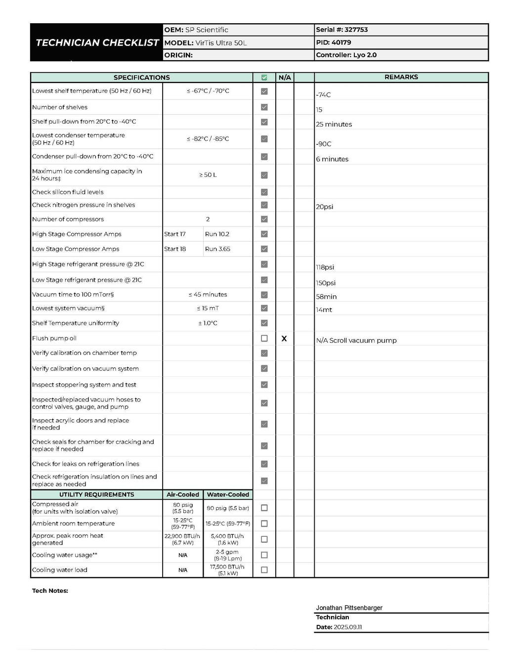 After its initial disinfection and inspection, our technicians tested the SP Scientific VirTis 50L Ultra EL-85°C pilot freeze dryer with the following results: