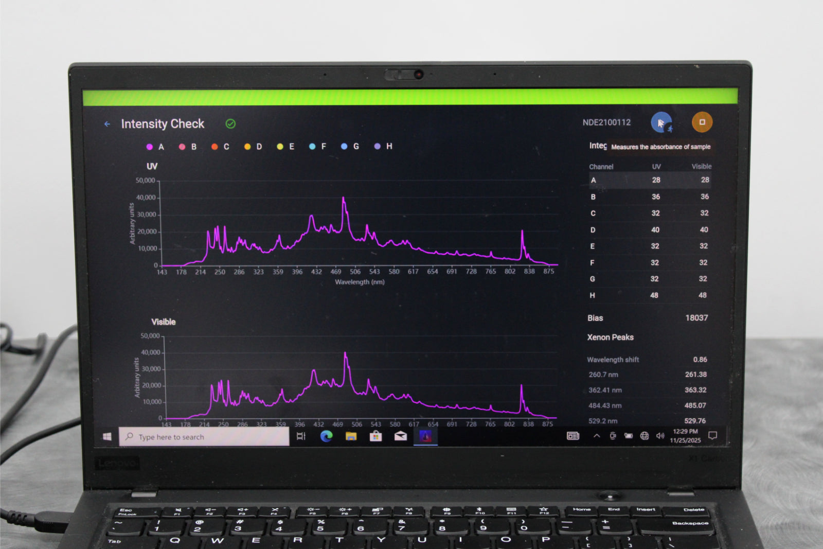 After its initial disinfection and inspection, our technicians tested the Thermo Scientific NanoDrop Eight UV-Vis spectrophotometer with the following results: