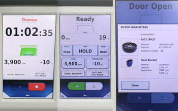 Multilingual selection, on-board training videos, user logging, user lock-out, automatic door opening, automatic rotor ID, on-screen display for imbalance, over temperature, stainless steel chamber, guidance display for error messages