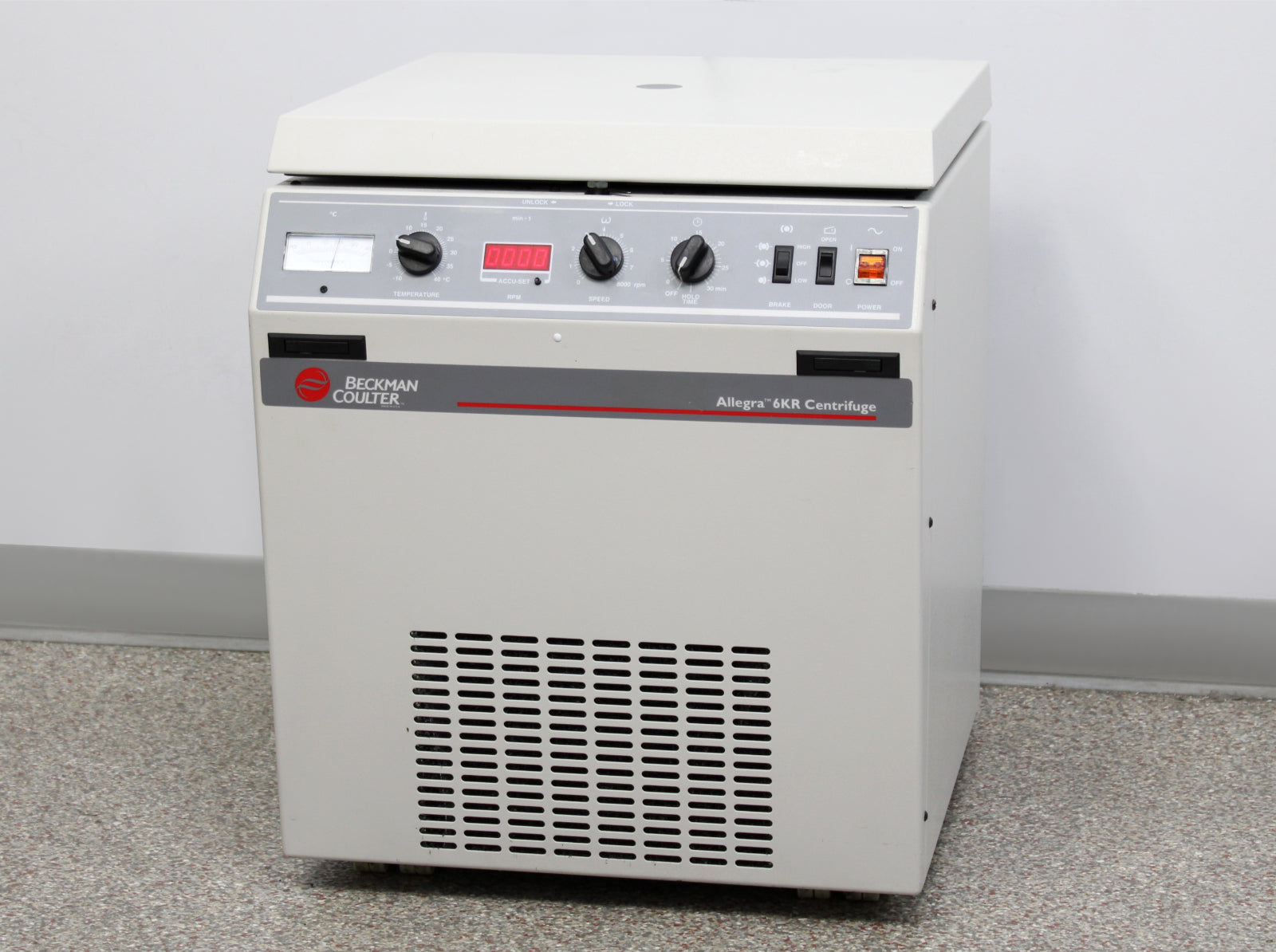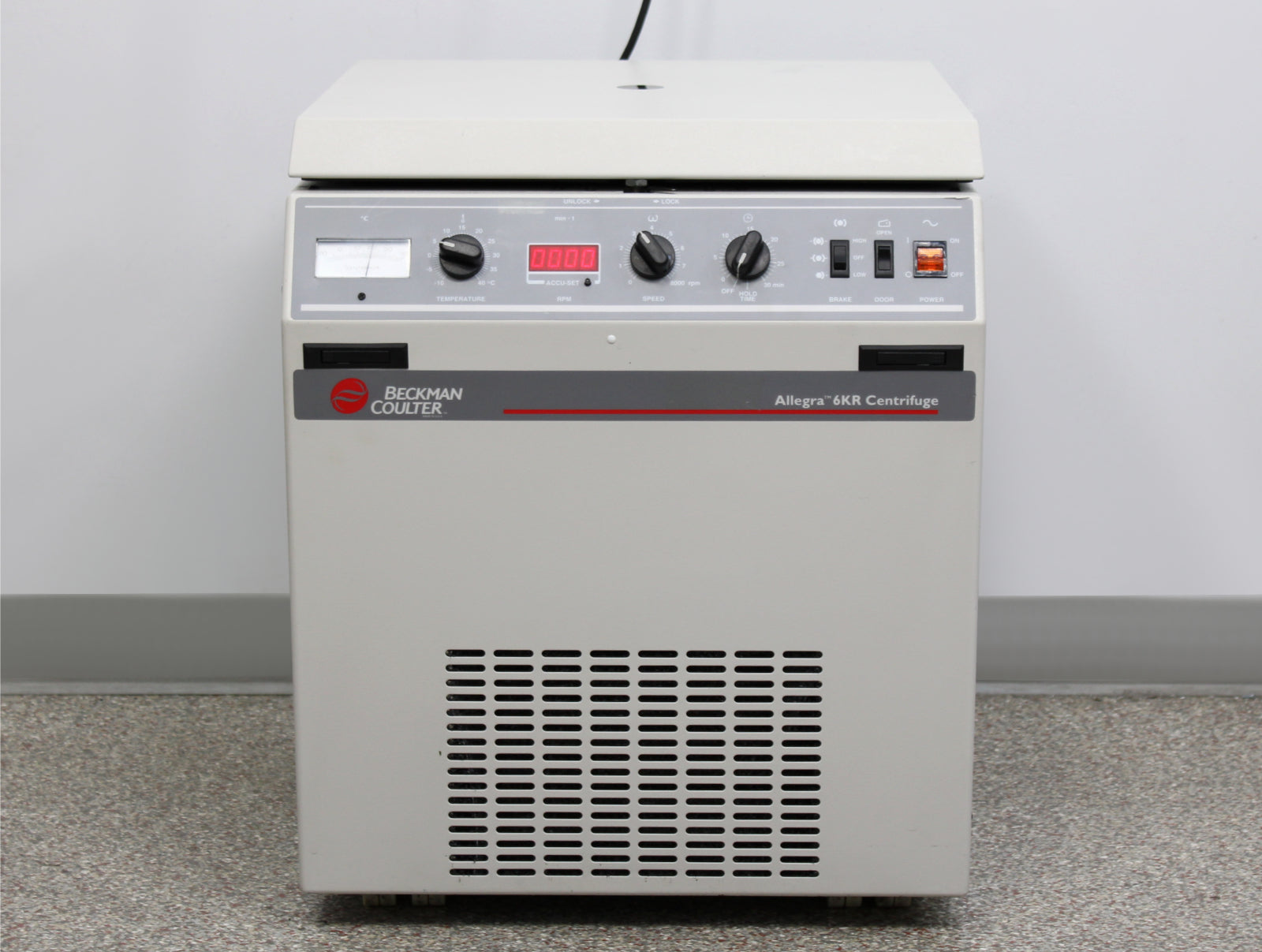 After its initial disinfection and inspection, our technicians tested the Beckman Coulter Allegra 6KR Kneewell refrigerated centrifuge with the following results: