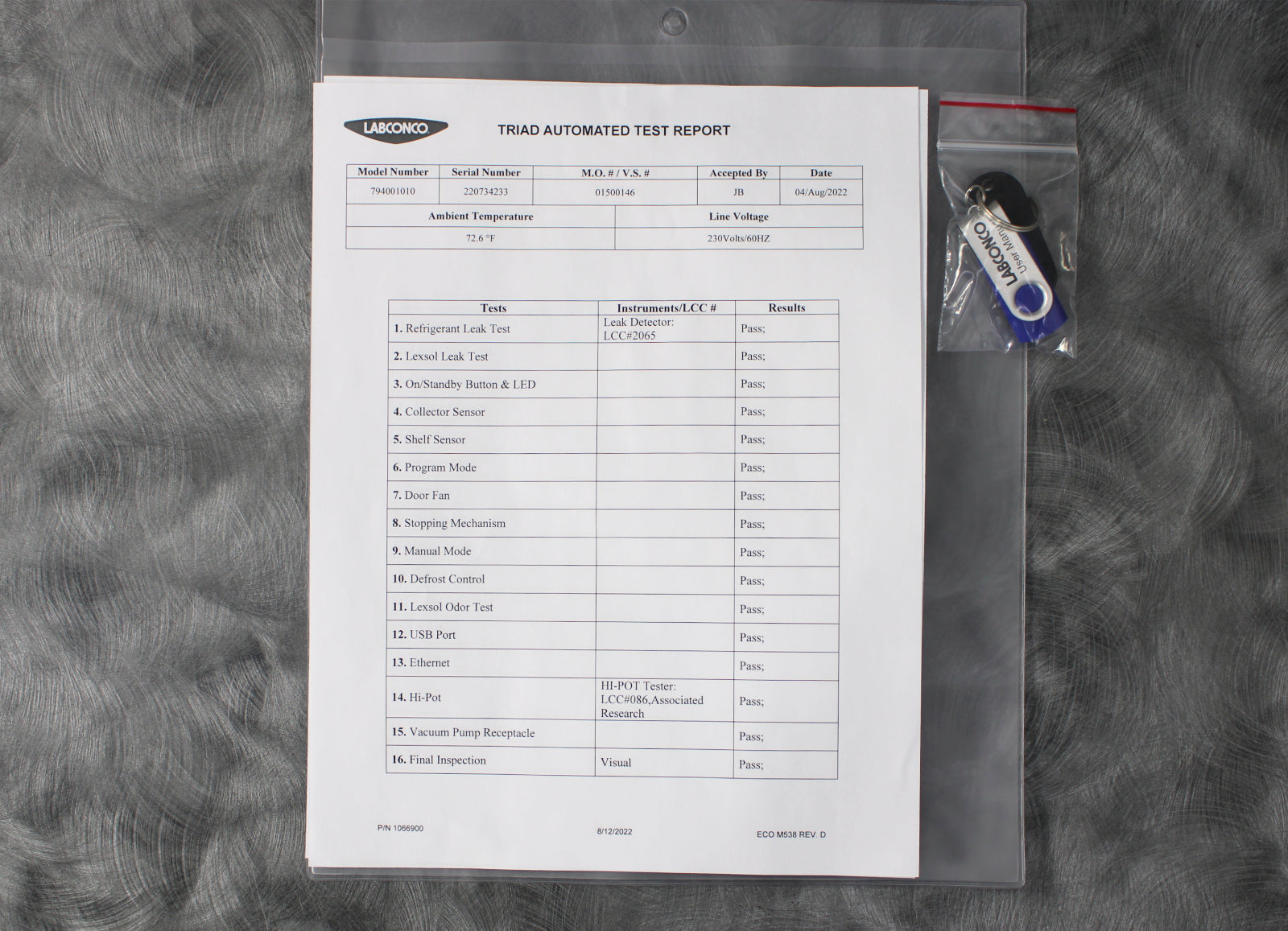 After its initial disinfection and inspection, our technicians tested the Labconco FreeZone Triad stoppering tray freeze dryer with the following results: