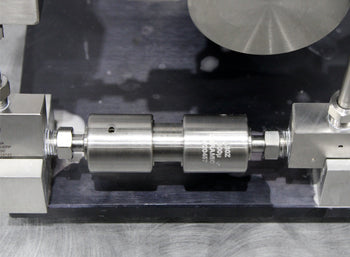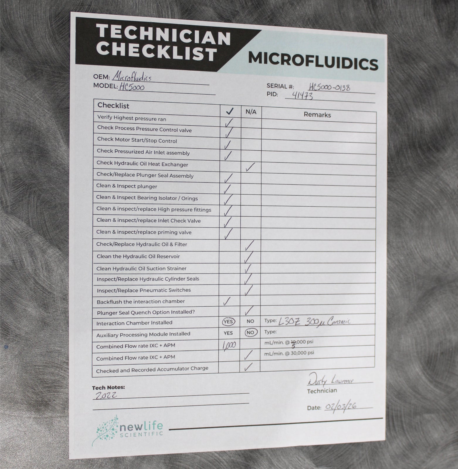 After its initial disinfection and inspection, our technicians tested the Microfluidics HC-5000 microfluidizer processor with the following results: