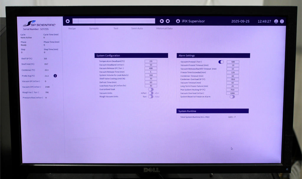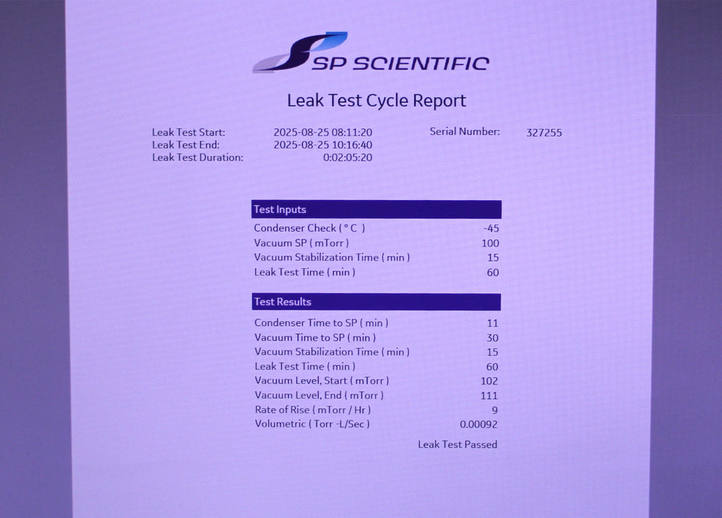 After its initial disinfection and inspection, our technicians tested the SP Scientific VirTis 50L Ultra EL-85°C pilot clean room freeze dryer with the following results: