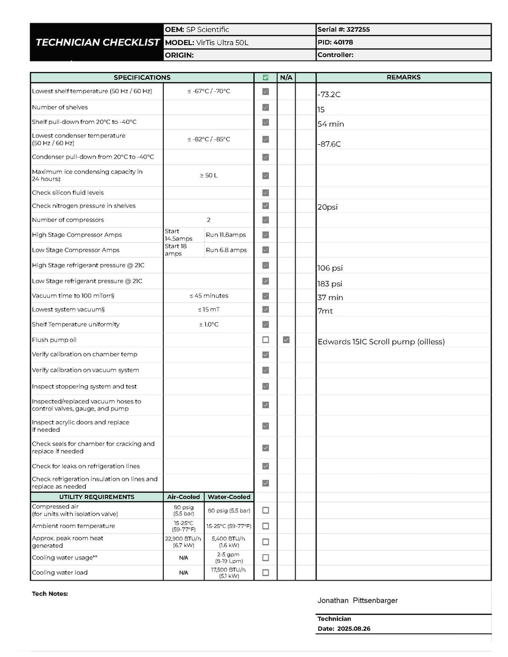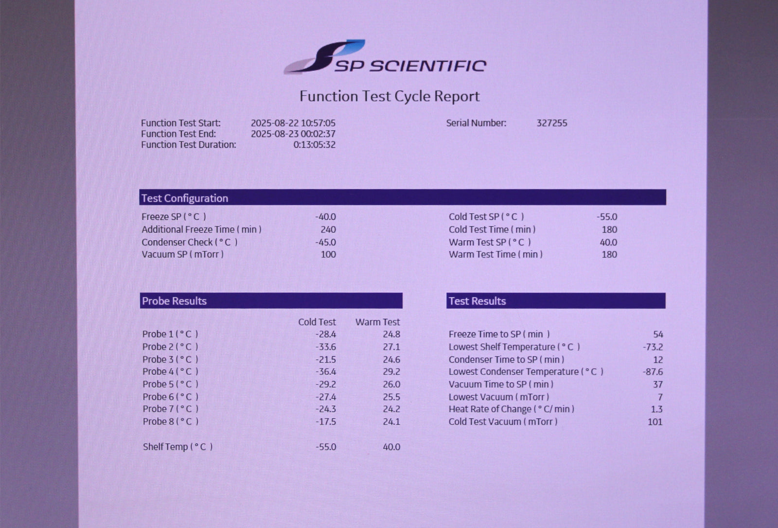 - Shelf temperature achieved -73.2°C (manufacturer’s spec): PASSED