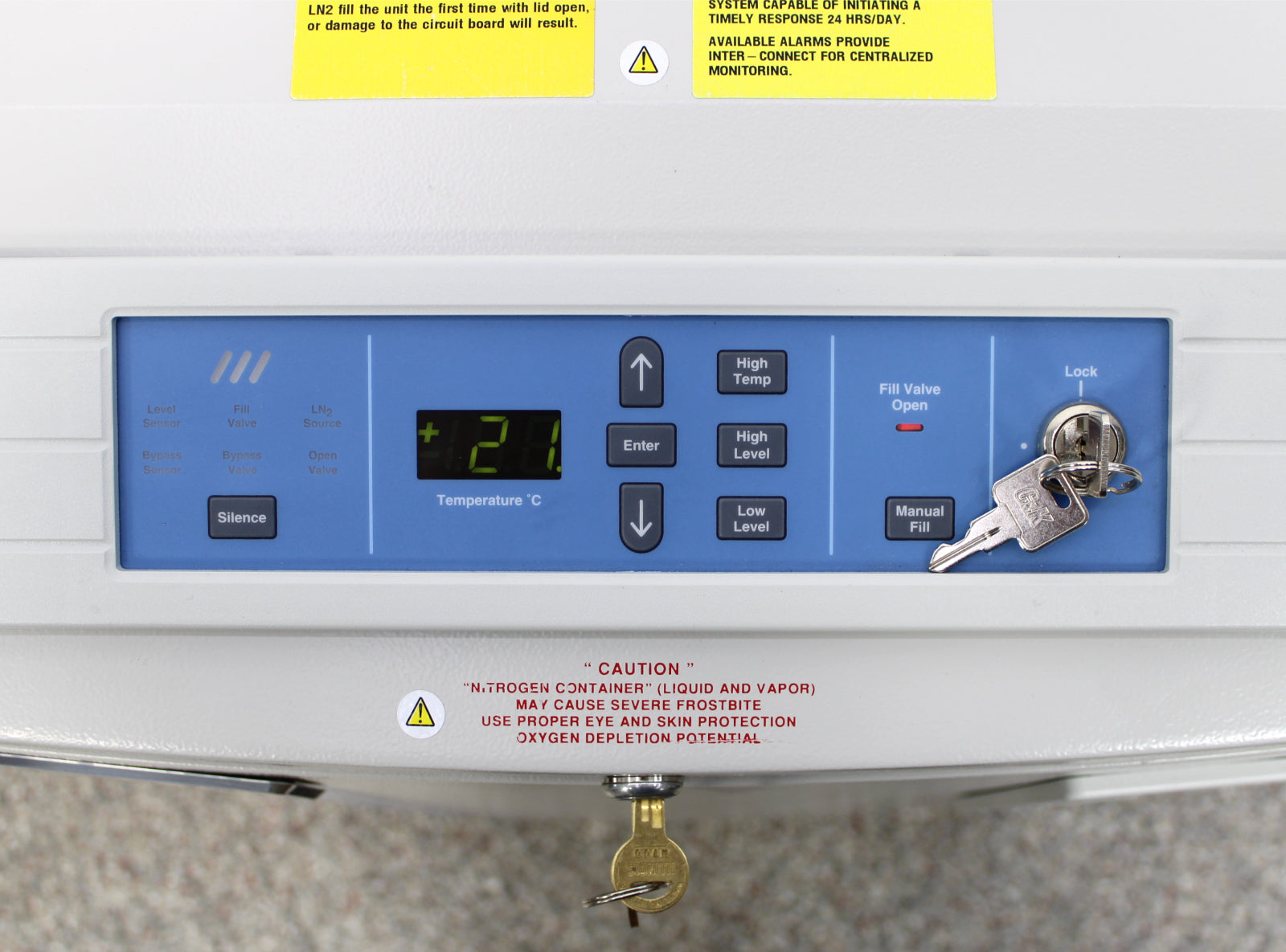 We powered on this CryoPlus 1 and heard the solenoid valve click which indicates the fill valve is working. There is no sign of leaks and the control panel is working. No further testing was performed.