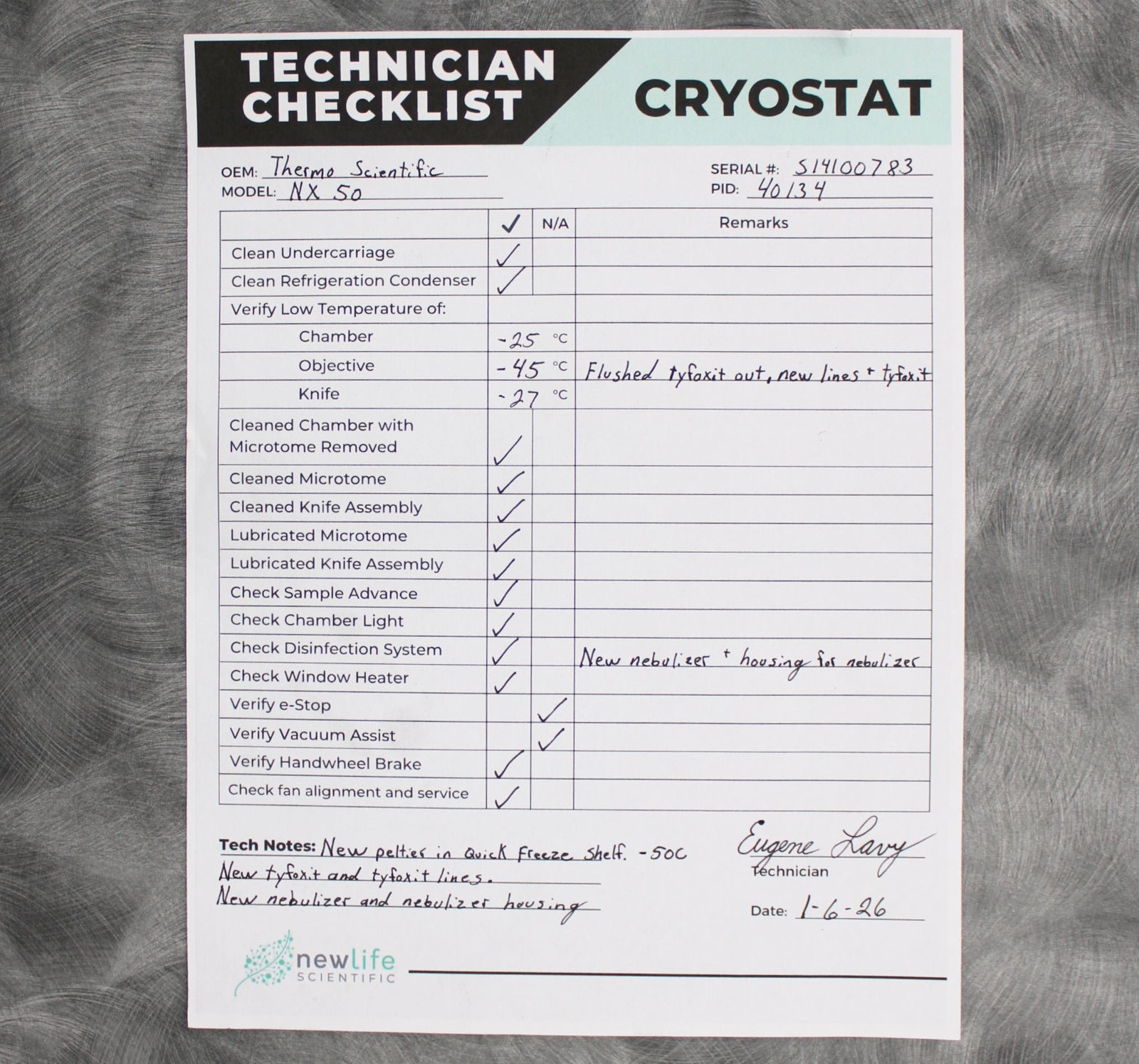 After its initial disinfection and inspection, our technicians tested the Thermo Scientific Microm CryoStar NX50 HOPD cryostat microtome with the following results: