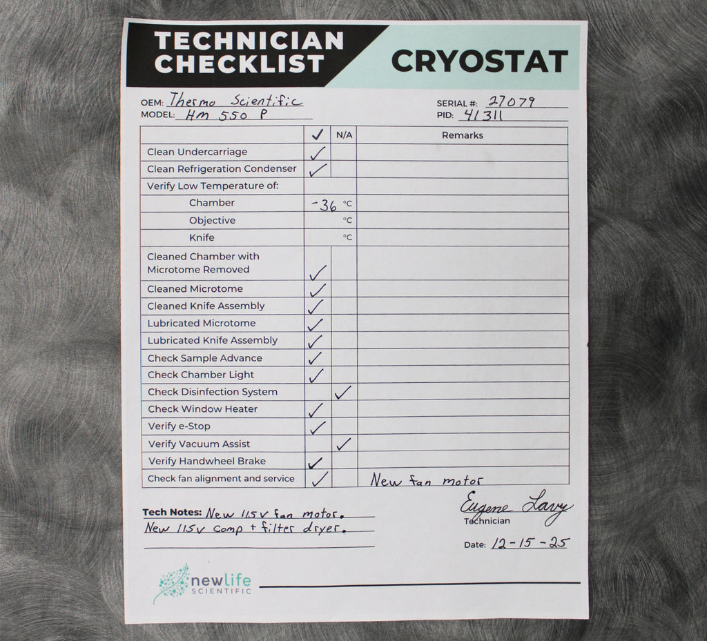 After its initial disinfection and inspection, our technicians tested the Thermo Scientific Microm HM 550 P microtome cryostat with the following results: